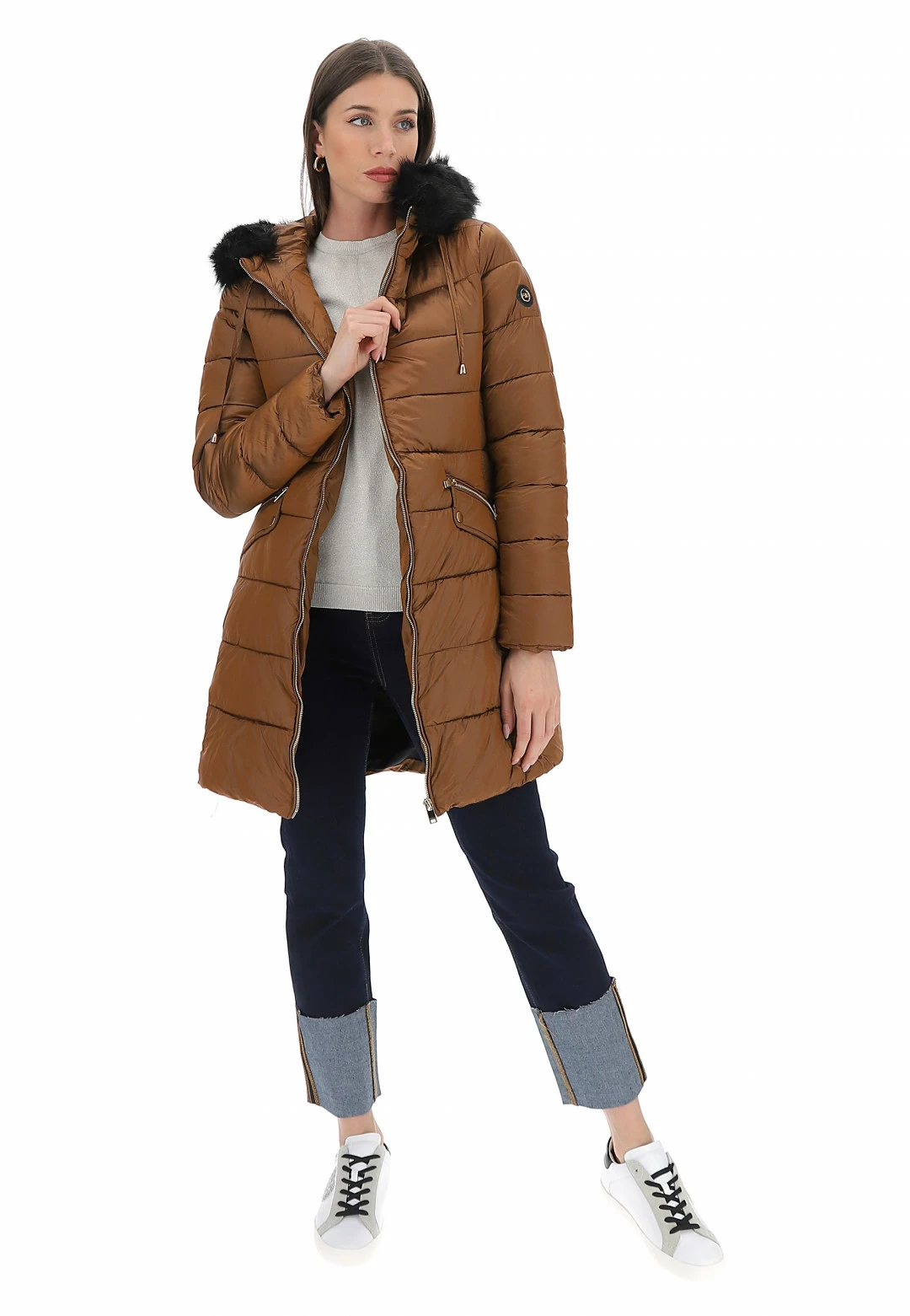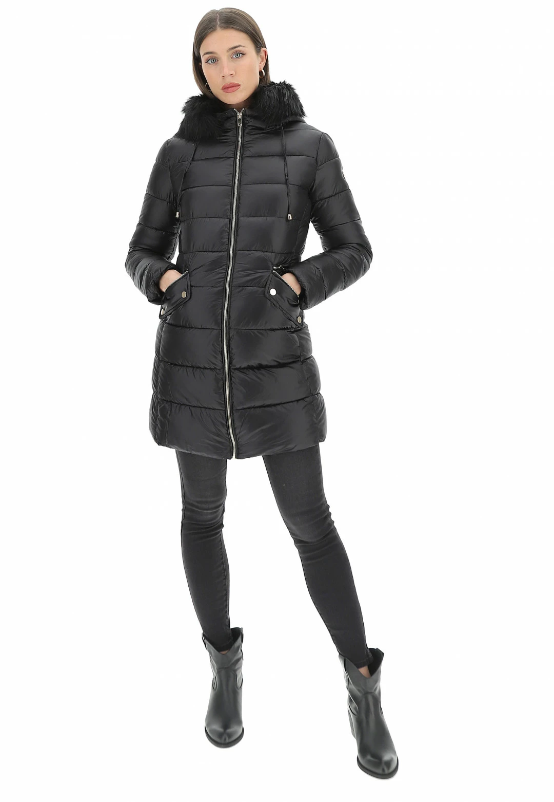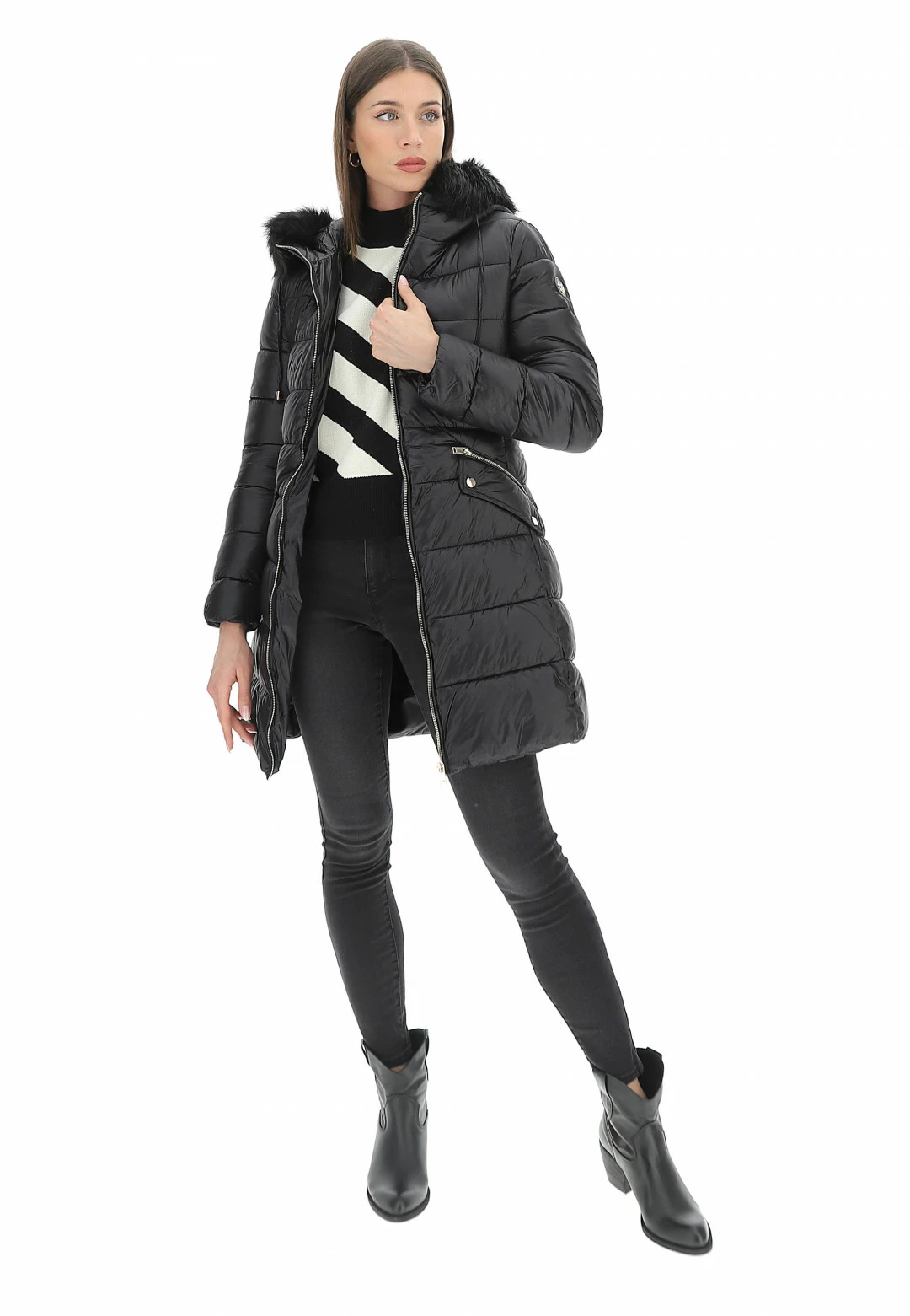 Giubbotto Lungo Artigli Ag35220 Con Cappuccio E Similpelliccia Remmovibile Con Dettagli A Contrasto